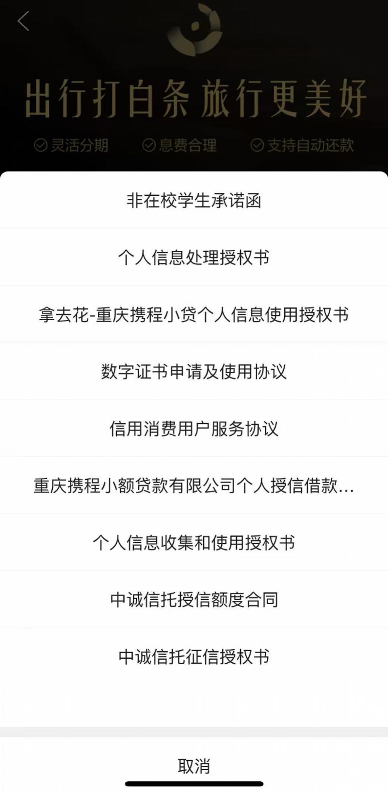例如,“拿去花”《个人信息使用授权书》明确显示,“本人授权被授权人从服务平台(指所有嵌入由服务运营商提供的信用消费服务的平台和应用程序,包括携程旅行App、去哪儿旅行App、携程金融App及被授权人合作的其他平台)收集并留存上述信息,同时授权服务平台向被授权人提供上述信息”。