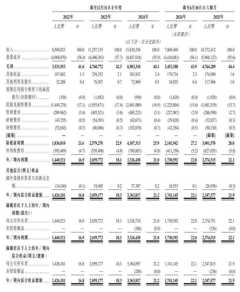 此外,该公司毛利率也逐年稳步上升,2022 - 2024年毛利率分别为41.6%、42.3%、44.1%,2025年上半年为44.4%。