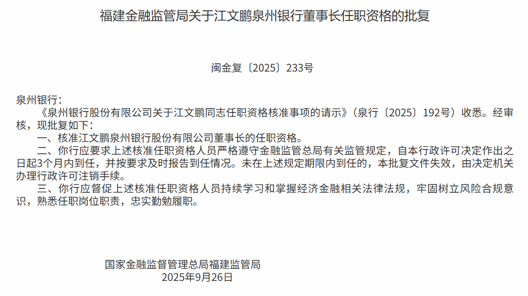 10月9日,国家金融监督管理总局福建金融监管局发布关于江文鹏泉州银行董事长任职资格的批复,核准江文鹏泉州银行股份有限公司董事长的任职资格。