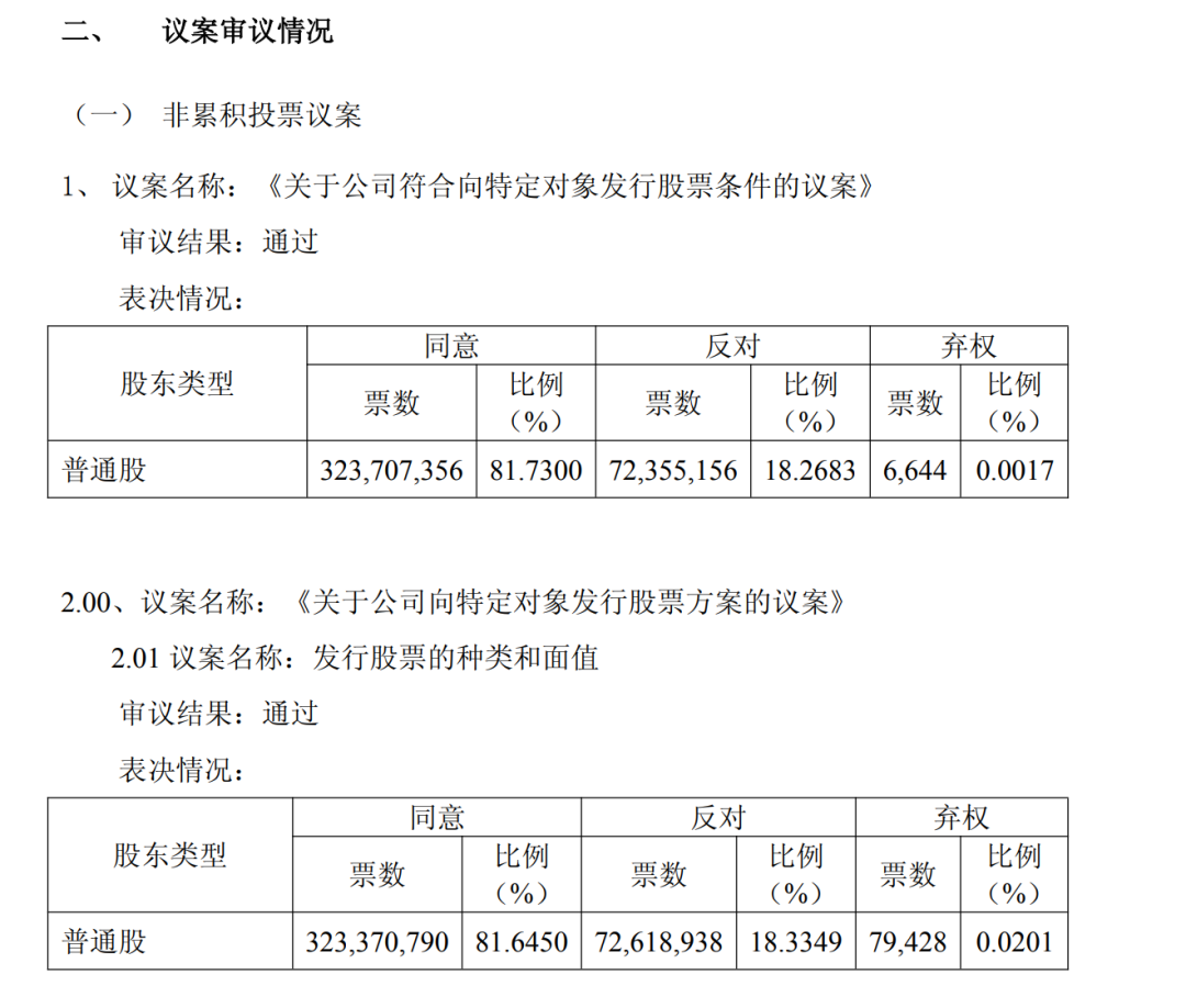根据公告披露的详细表决结果,包括发行方案、募集资金用途、引入战略投资者等在内的十余项核心议案均获通过,赞成率均超过81%。其中,《关于公司符合向特定对象发行股票条件的议案》同意票数达3.23亿股左右,赞成率高达81.73%;《关于公司向特定对象发行股票方案的议案》各项子议案全部通过。《关于公司引入战略投资者并签署<战略合作协议>的议案》赞成率达81.38%。