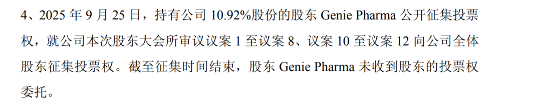 值得注意的是,尽管Genie Pharma在会前公开征集投票权反对定增,但公告显示,截至征集时间结束,其未能获得其他股东的投票权委托。本次股东大会参与度较高,出席会议的股东及代理人共438人,代表股份占公司总股本的60.41%。