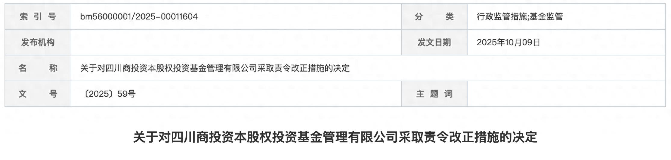 10月9日,四川证监局发布两则监管措施公告,对四川商投资本股权投资基金管理有限公司(简称“四川商投”)及相关责任人分别采取责令改正措施及下发警示函。