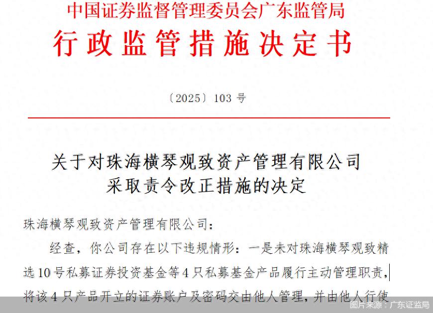 10月9日,广东证监局发布公告表示,珠海横琴观致资产管理有限公司(以下简称“横琴观致资管”)存在以下违规情形:未对珠海横琴观致精选10号私募证券投资基金等4只私募基金产品履行主动管理职责,将该4只产品开立的证券账户及密码交由他人管理,并由他人行使交易职责。未自行或委托第三方机构对所管理的私募基金产品进行风险评级。未在内部制度中明确投资者与产品适当性匹配的具体依据、方法、流程。综上,横琴观致资管被监管责令改正。