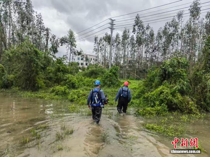 10月6日,南方电网广东湛江吴川供电局抢修人员涉水进行抢修送电操作。(广东电网公司 供图)