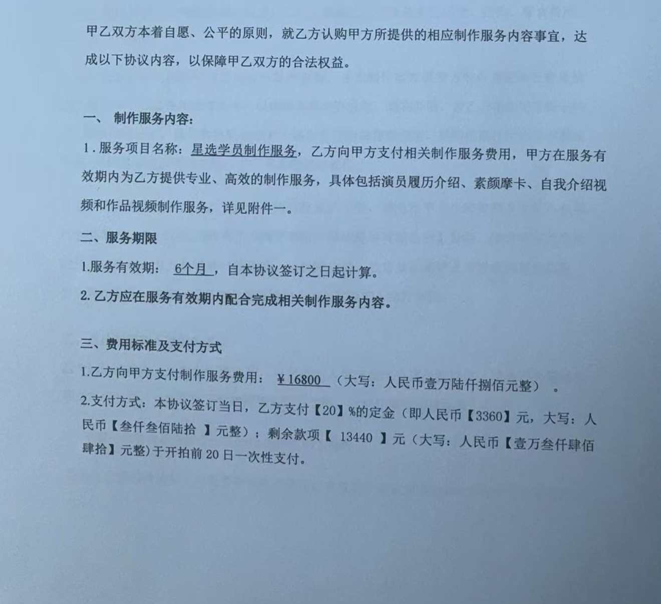 回过头来重新审读合同,她才意识到条款中只列明了培训课时、模卡拍摄等基础服务,而“提供演出机会”这一最关键的口头承诺,从未出现在纸面上。合同中甚至还列有“包装费不予退还”等明显不公的条款。