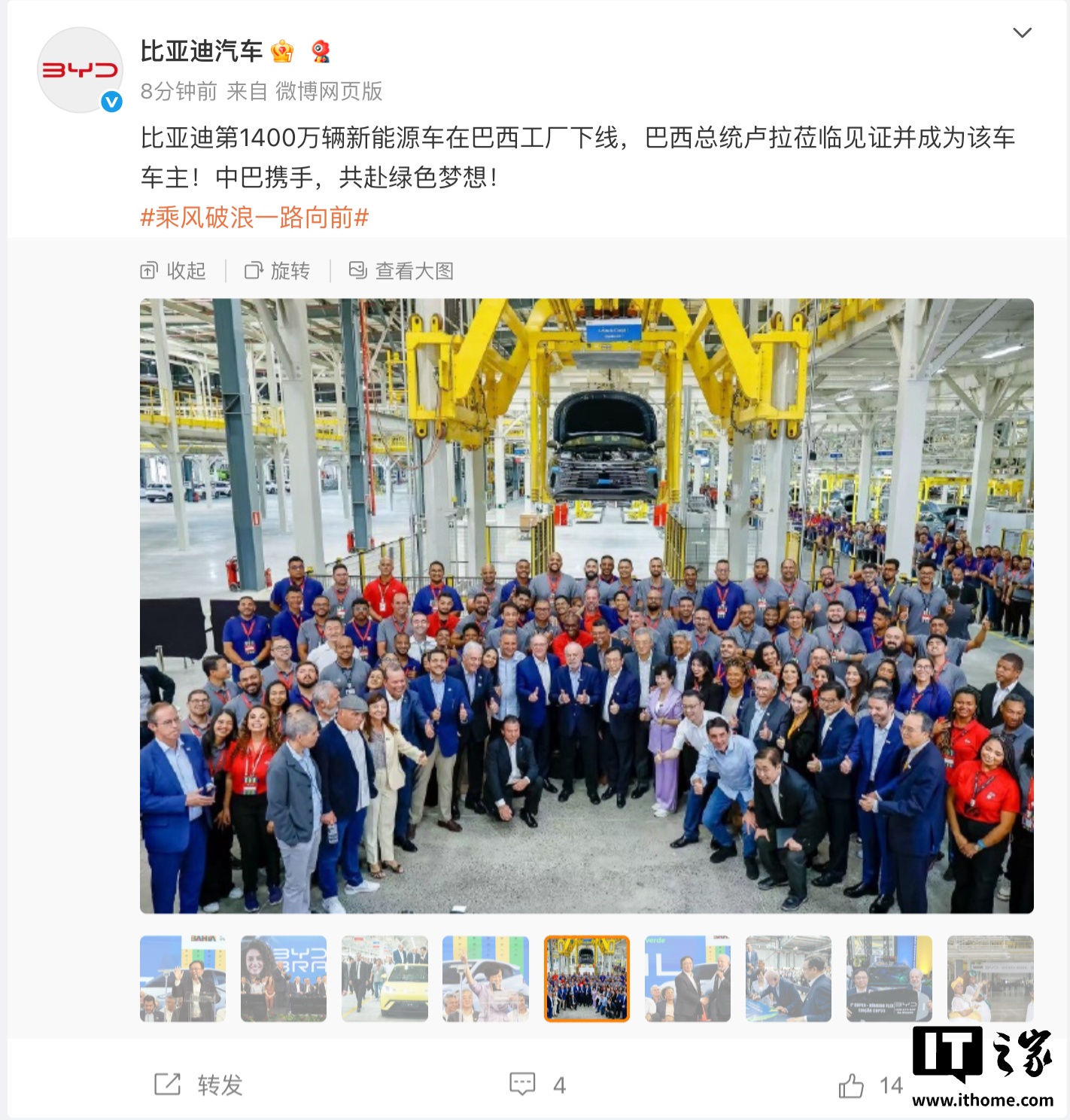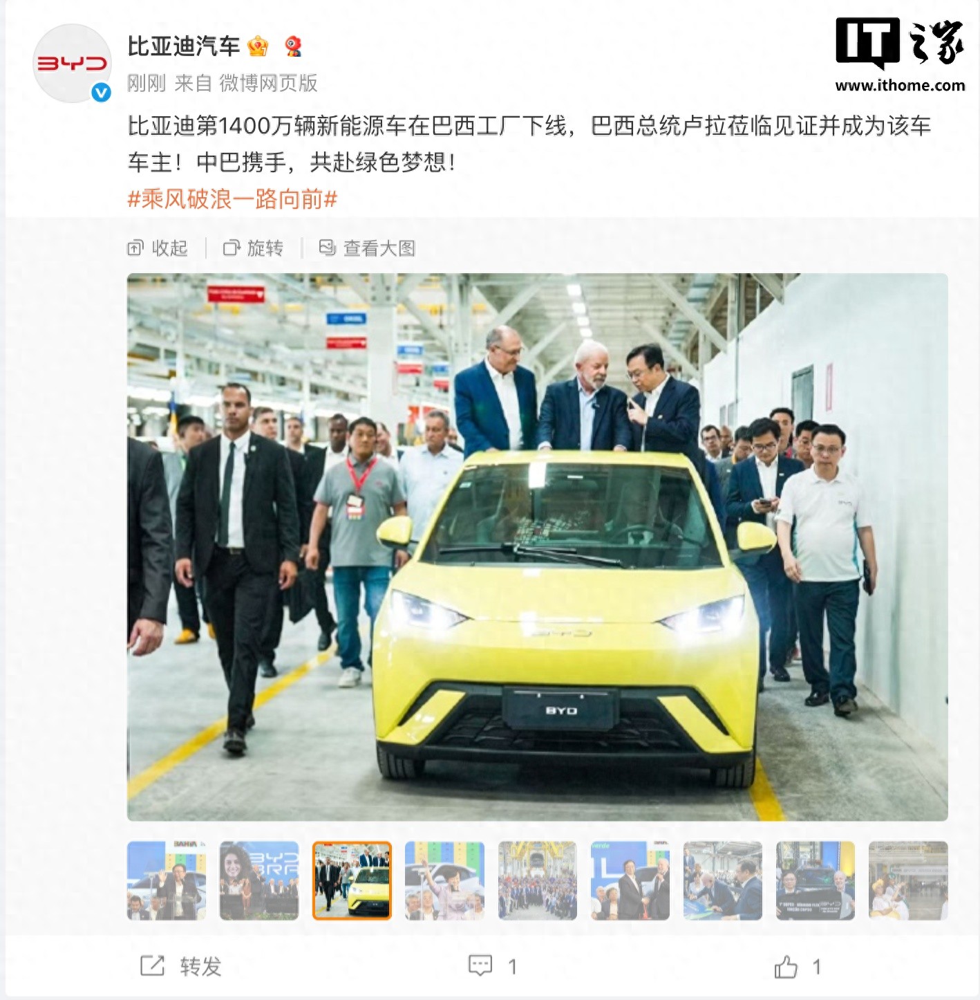 据比亚迪汽车官微,比亚迪第 1400 万辆新能源汽车在巴西工厂下线,巴西总统卢拉莅临见证,并成为该车车主。