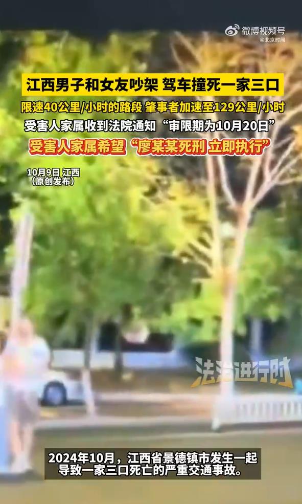 10月9日,江西(原创发布)。江西男子和女友吵架,驾车撞死一家三口,受害人家属:收到法院通知,“审限期为10月20日”,希望“廖某某死刑,立即执行”。