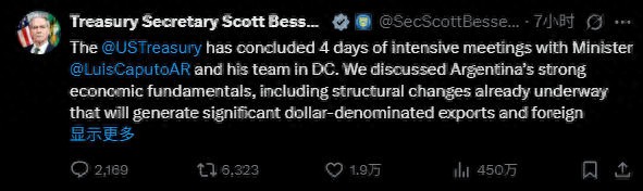 贝森特还称:“阿根廷正面临严重的资金流动性短缺……一个强大、稳定、有助于巩固西半球繁荣的阿根廷,符合美国的战略利益。阿根廷的成功应成为美国两党共同的优先事项。”