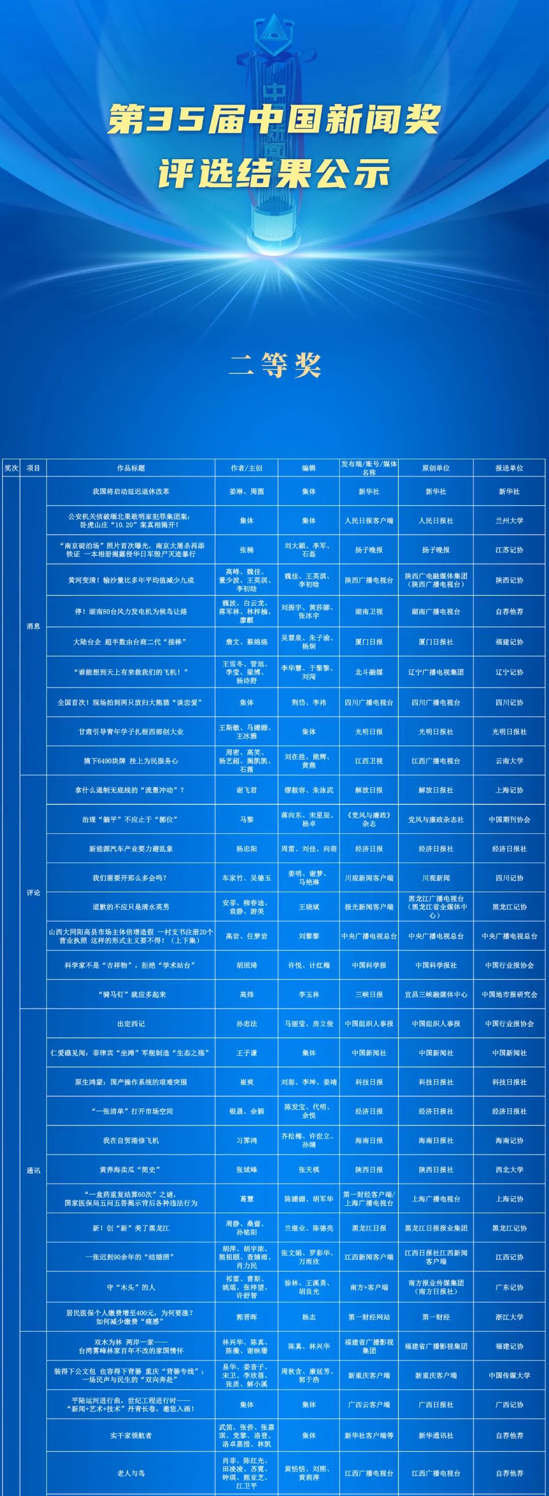 10月10日,中国记协微信公众号公布了关于公示第35届中国新闻奖评选结果的公告,全文如下:
