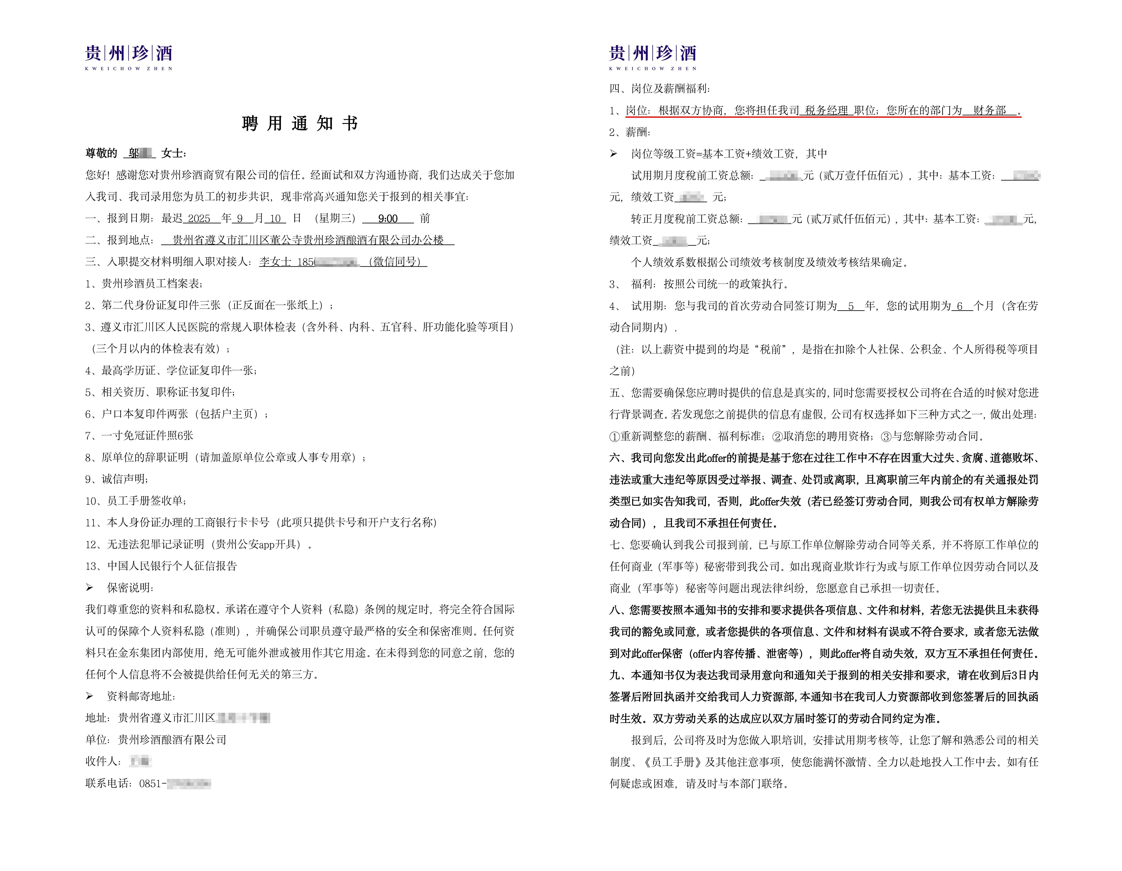 贵州珍酒向邬女士发的《聘用通知书》中,不仅罗列了入职所需材料,还约定了报到时间、薪酬福利等。经双方协商确认,邬女士新职位是税务经理,所在部门为财务部,试用期6个月,首次合同签订期为5年。