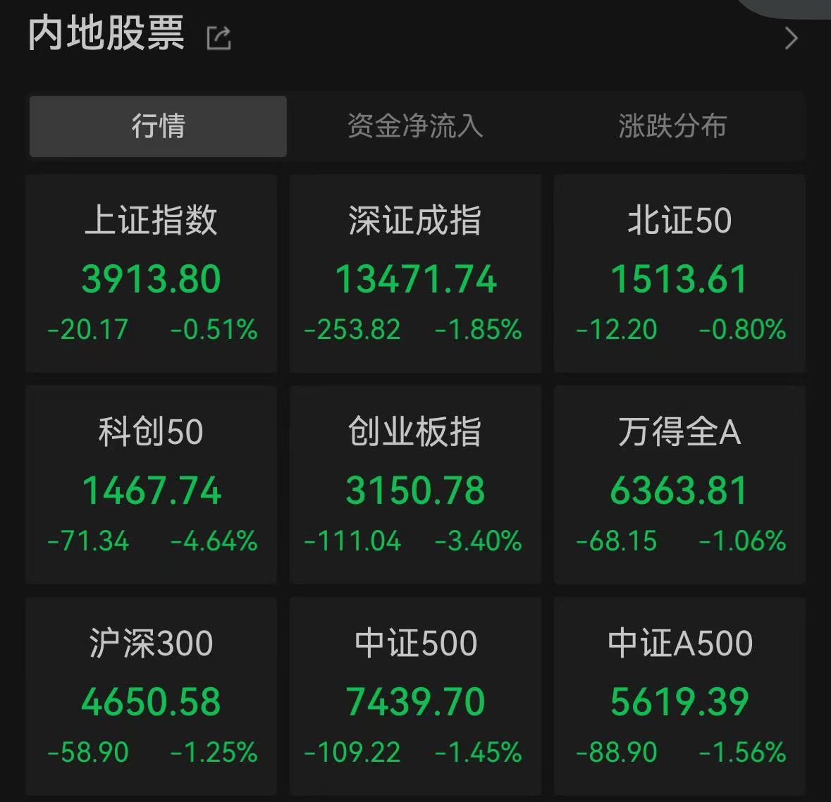 截至午间收盘,沪指跌0.51%,深成指跌1.85%,创业板指跌3.40%。