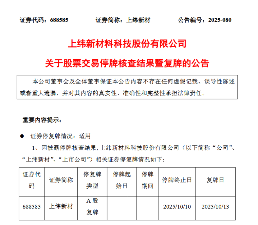 昨日(10月10日)晚间,上纬新材发布公告,其股票将于2025年10月13日(星期一)开市起复牌。