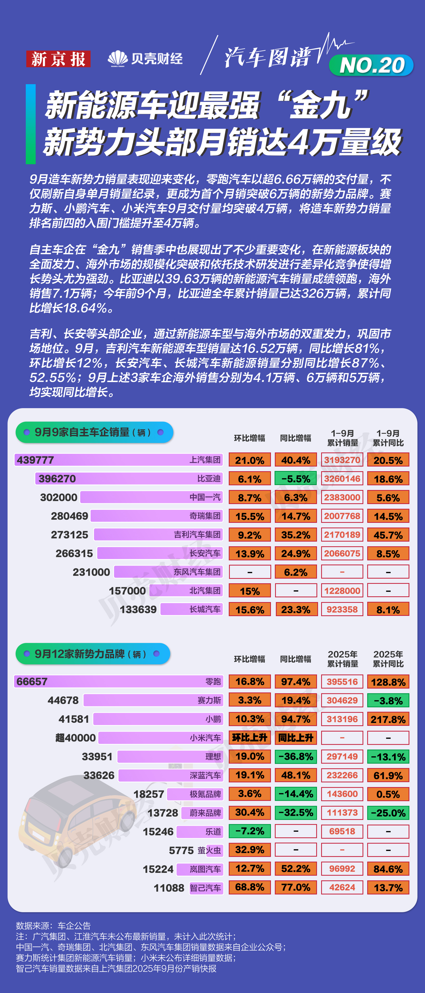 造车新势力销量表现迎来变化,零跑汽车以超6.66万辆的交付量,不仅刷新自身单月销量纪录,更成为首个月销突破6万辆的新势力品牌。赛力斯、小鹏汽车、小米汽车9月交付量均突破4万辆,将造车新势力销量排名前四的入围门槛提升至4万辆。