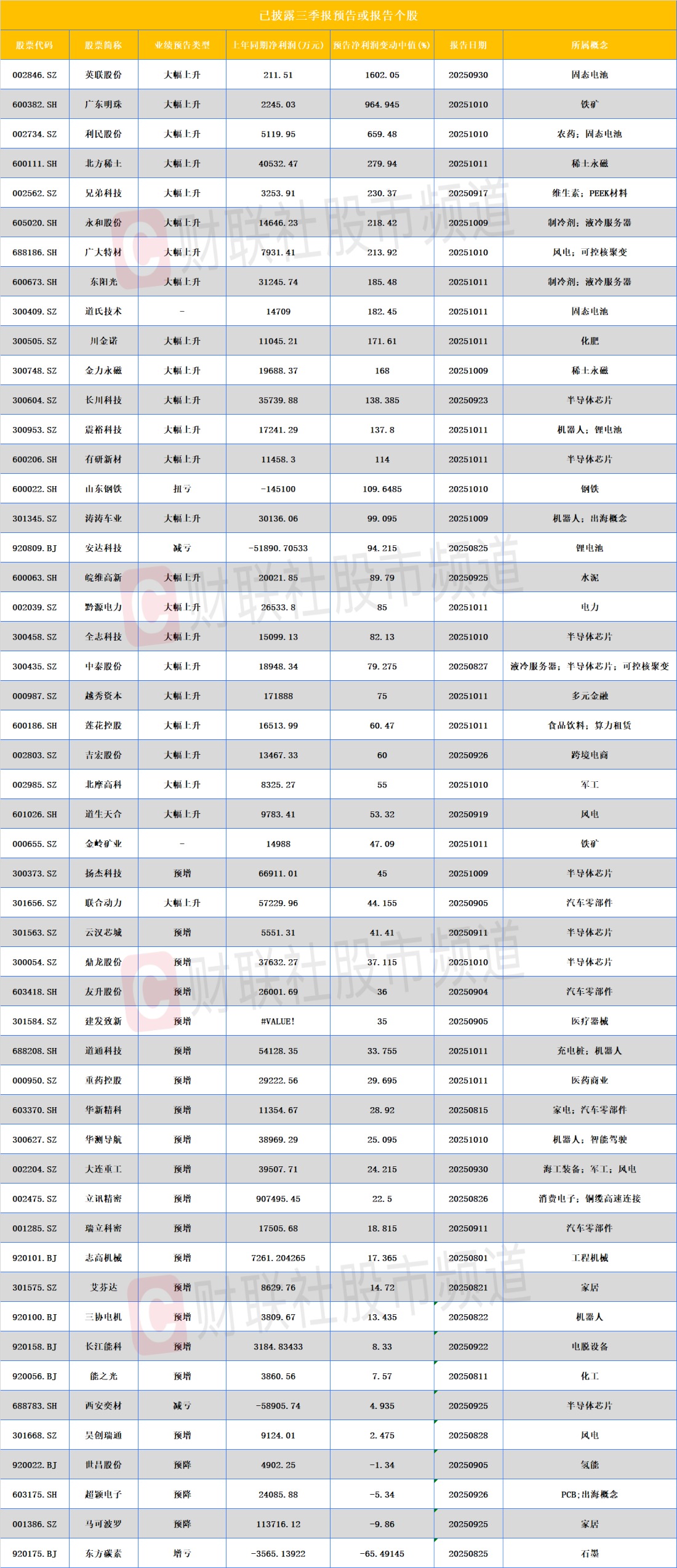 上表按净利润变动中值排序列出了已披露三季报预告或报告的个股情况,其中英联股份2025年前三季度净利润预计同比增长1531.13%–1672.97%暂居首位,此外广大特材、永和股份、兄弟科技、北方稀土、利民股份、广东明珠等个股前三季度净利预增超200%。