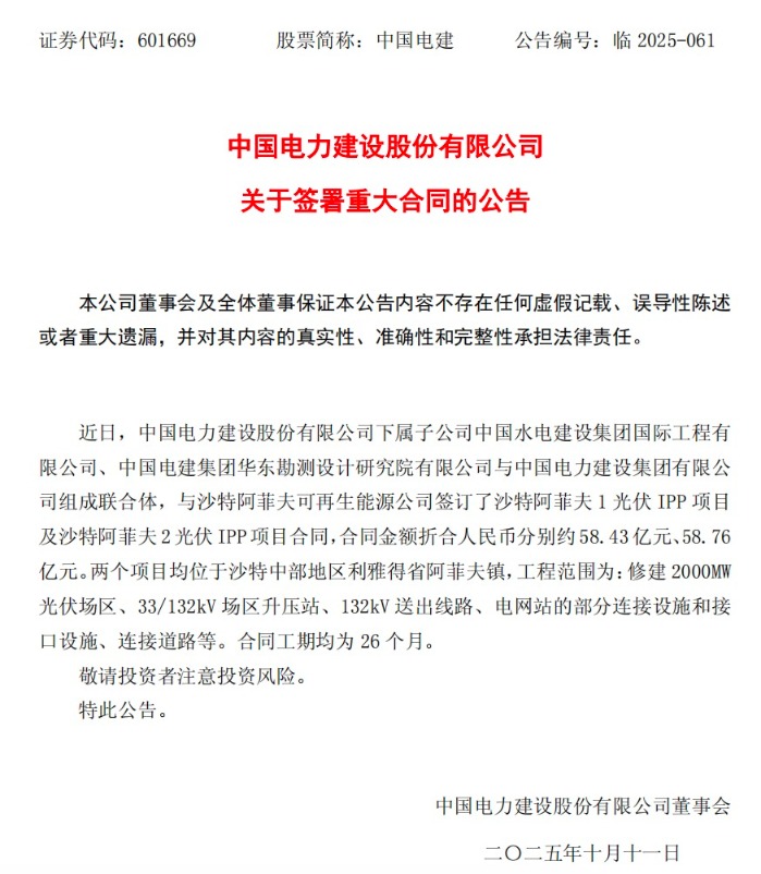 具体来看,中国电建下属子公司中国水电建设集团国际工程有限公司、中国电建集团华东勘测设计研究院有限公司与中国电力建设集团有限公司组成联合体,与沙特阿菲夫可再生能源公司签订了沙特阿菲夫1光伏和沙特阿菲夫2光伏项目合同。