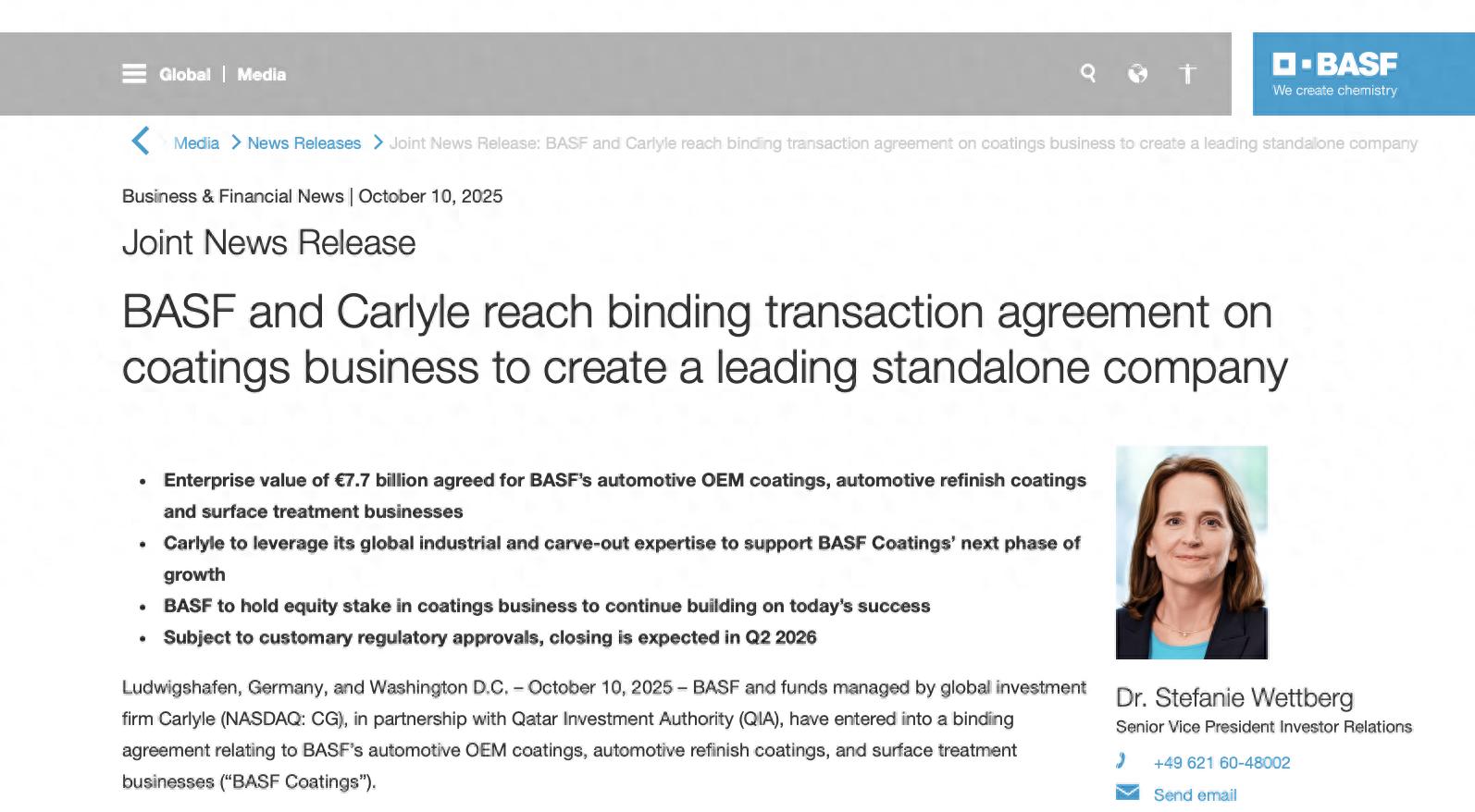 10月10日,巴斯夫宣布,将以77亿欧元估值(约合635亿元人民币)剥离其涂料业务,与美国私募股权巨头凯雷集团旗下基金及卡塔尔投资局(QIA)共同组建一家全新的独立公司。