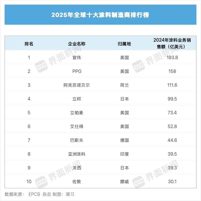 根据美国《PCI》杂志发布的2025年全球十大涂料企业榜单,巴斯夫以销售额44.6亿美元位列第七。该排名基于2024年涂料销售收入,其他非涂料产品的销售收入不包括在内。排名前三的企业是宣伟、PPG、阿克苏诺贝尔,分别实现销售额约193.8亿美元、158亿美元、111.6亿美元。