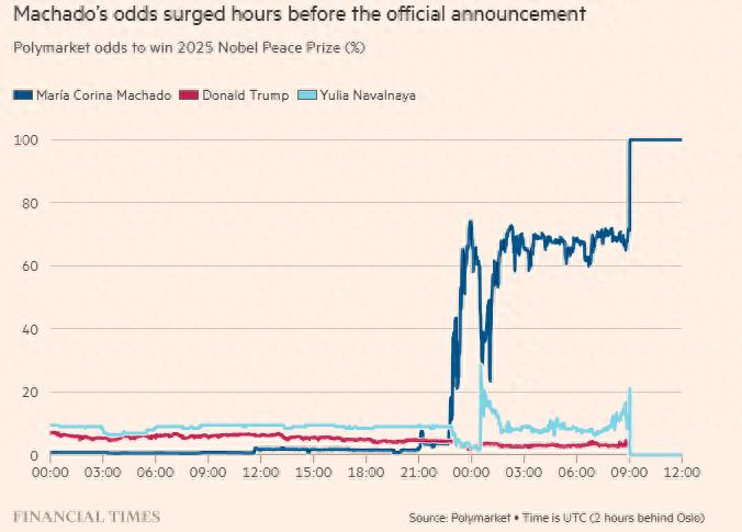 就在委内瑞拉反对派领袖马查多(Maria Corina Machado)被宣布成为今年诺贝尔和平奖得主的数小时前,网络预测平台上押注她即将胜出的投注陡然激增。目前,挪威诺贝尔研究所正在调查可能的泄密事件……
