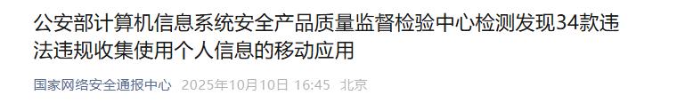 10月10日,据国家网络安全通报中心微信公号消息,依据《网络安全法》《个人信息保护法》等法律法规,按照《中央网信办、工业和信息化部、公安部、市场监管总局关于开展2025年个人信息保护系列专项行动的公告》要求,经公安部计算机信息系统安全产品质量监督检验中心检测,34款移动应用存在违法违规收集使用个人信息情况,具体通报如下: