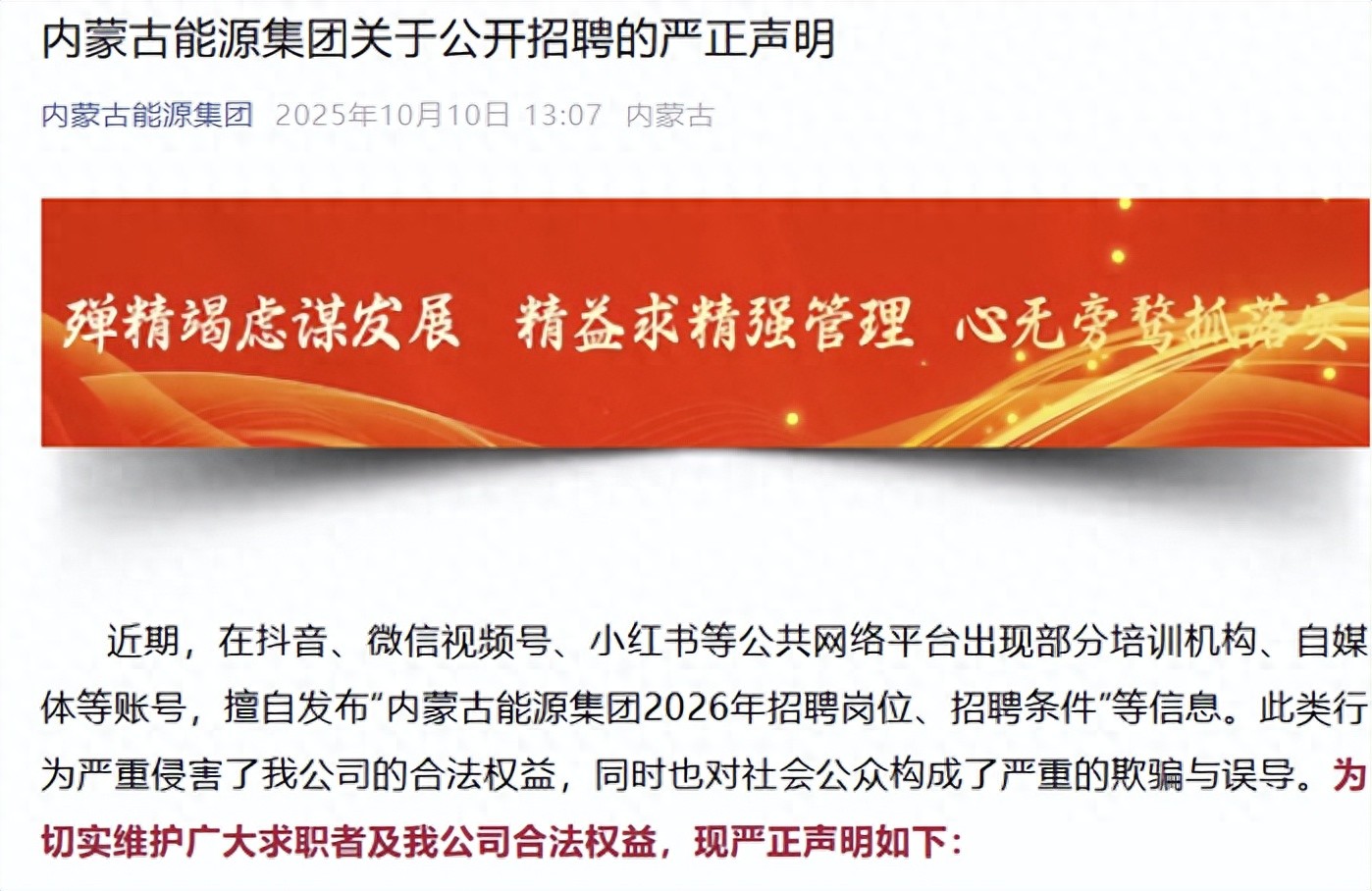 近期,在抖音、微信视频号、小红书等公共网络平台出现部分培训机构、自媒体等账号,擅自发布“内蒙古能源集团2026年招聘岗位、招聘条件”等信息。此类行为严重侵害了我公司的合法权益,同时也对社会公众构成了严重的欺骗与误导。为切实维护广大求职者及我公司合法权益,现严正声明如下: