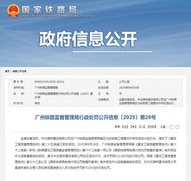 来自国家铁路局的消息显示:近日,广州铁路监督管理局发布《行政处罚公开信息〔2025〕第28号》(以下简称《公开信息》)。《公开信息》称,监督检查发现,中交路桥建设有限公司在广州铁路监督管理局辖区内的铁路工程建设中存在违法分包行为,违反了《建设工程质量管理条例》第二十五条第三款的规定。