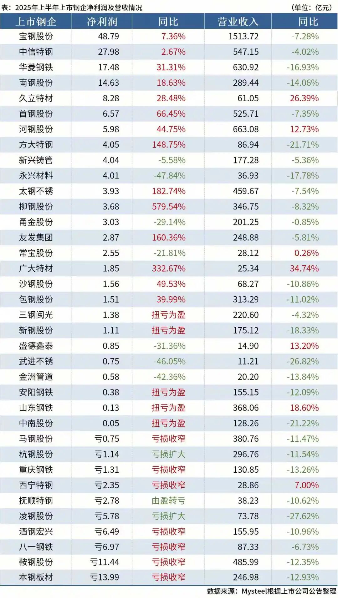 然而,并非所有企业都表现亮眼。记者注意到,本钢板材上半年亏损13.99亿元,是上市钢企中亏损最多的企业。钒钛股份净利润同比下降245.15%,亏损达1.99亿元。