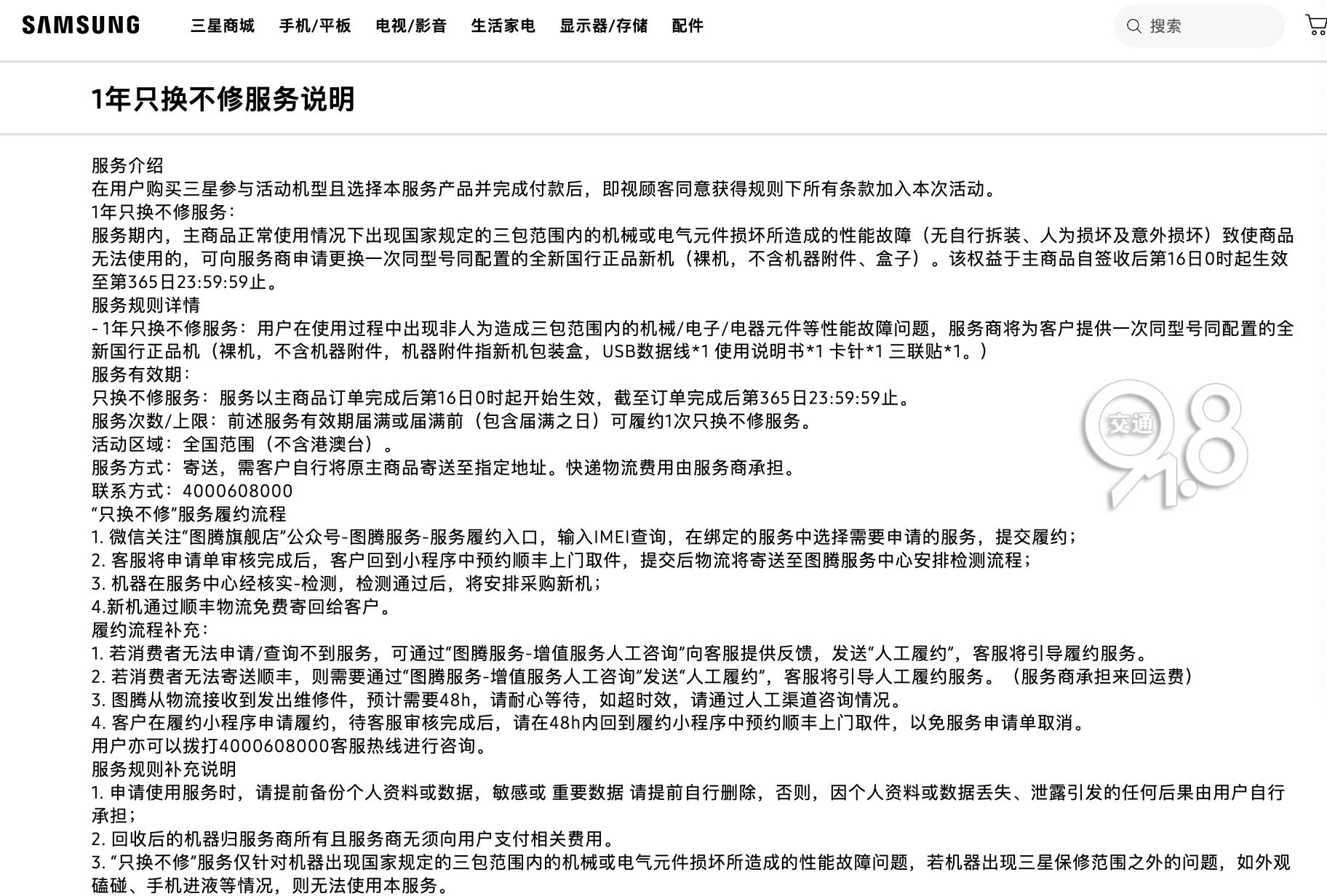 记者在三星商城中翻找“只换不修”的服务政策,页面中并没有显示。通过搜索栏搜索可以查找到“只换不修”的服务条款,条款中标明“服务期内,主商品正常使用情况下出现国家规定的三包范围内的机械或电气元件损坏所造成的性能故障(无自行拆装、人为损坏及意外损坏)致使商品无法使用的,可向服务商申请更换一次同型号同配置的全新国行正品新机(裸机,不含机器附件、盒子)。”但并未标明什么产品、如何购买才能够使用。