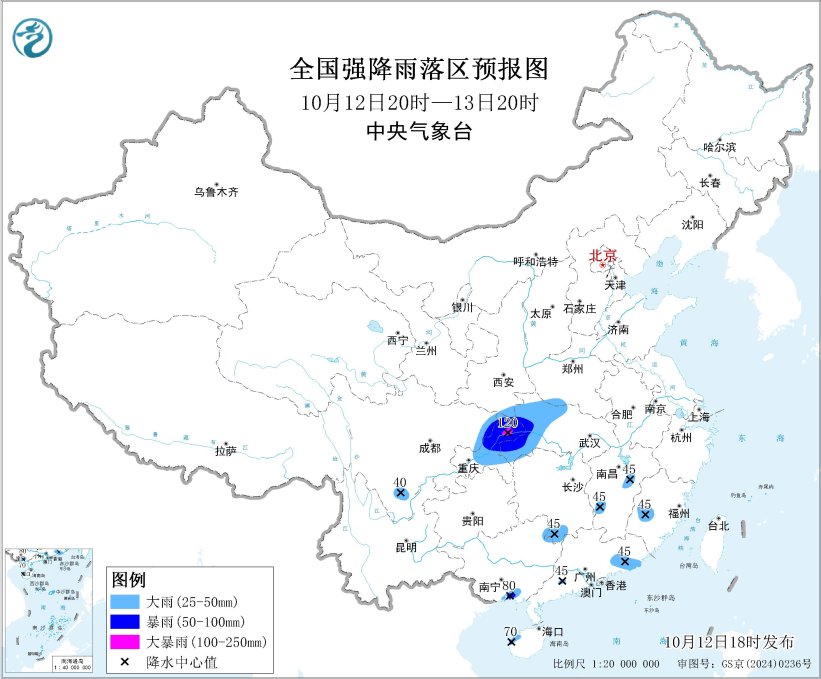 预计,10月12日20时至13日20时,陕西东南部、四川东北部、重庆中北部、湖北西部、河南西南部等地的部分地区有大到暴雨,其中,重庆北部等地局地大暴雨(100~120毫米)。另外,广东东部和西南部、广西南部、海南岛西部、湖南南部、江西南部和东部、福建西部等地局地有大雨或暴雨(50~80毫米),上述部分地区伴有短时强降水(最大小时降雨量20~40毫米,局地可超过50毫米),局地有雷暴大风等强对流天气。