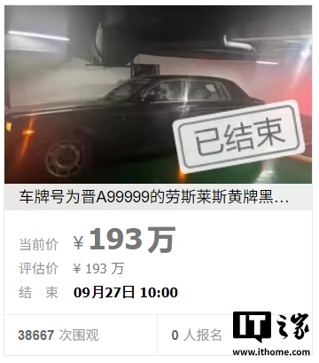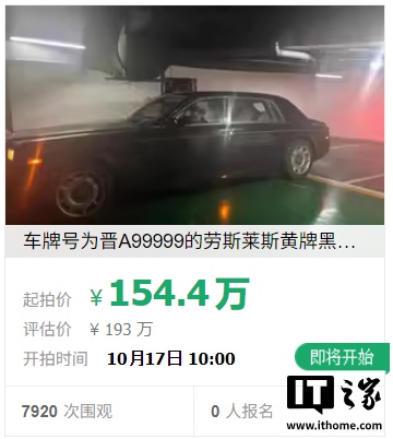 13日,阿里拍卖平台显示,一辆车牌号为晋 A99999 的劳斯莱斯黄牌黑色轿车将于 10 月 17 日被司法拍卖,起拍价 154.4 万元,评估价 193 万元。