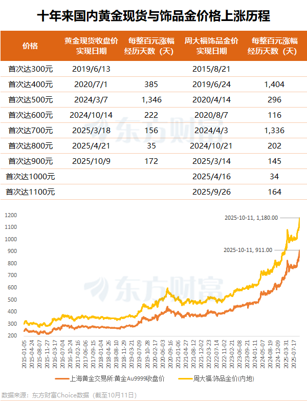 国内品牌金饰价格随之水涨船高,最新克价已经站上1180元/克。截至10月12日,老庙黄金足金饰品报价1183元/克,周大福、六福珠宝、金至尊均为1180元/克,周生生足金饰品报价1176元/克,老凤祥足金饰品报价1172元/克。