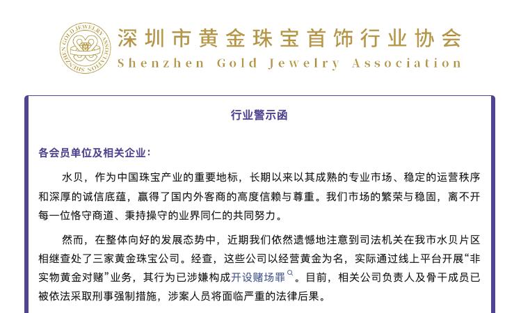 11日,深圳市黄金珠宝首饰行业协会官方发布行业警示函,其中提到,深圳水贝三家黄金珠宝公司被司法机关查处。这些公司以经营黄金为名,实际通过线上平台开展“非实物黄金对赌”业务,其行为已涉嫌构成开设赌场罪。