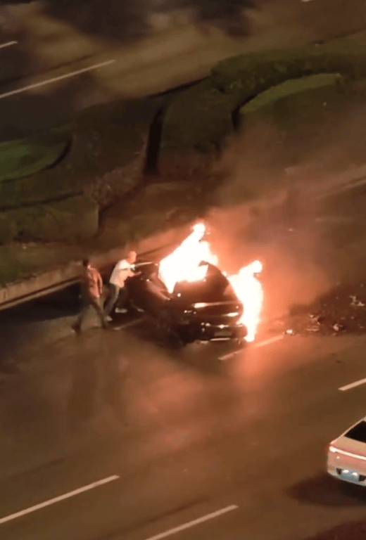 多则现场视频显示,一辆小车在路中起火,车主疑似被困车内。有多名路人上前尝试营救,先后尝试拉开车门,撞击车窗。有人找来锤子成功打开主驾驶位车窗后,发现车内火势太大,有其他的车主拿来灭火器,在灭火途中车辆突然发出异响,蹿出明显火势。路人连忙后退。
