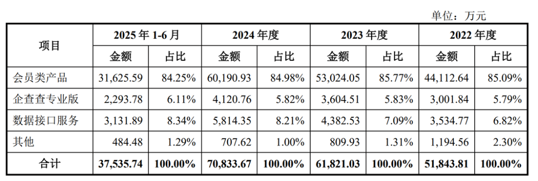 招股书显示,企查查的会员类产品收入占比超84%,构成了其业务的基本盘。2024年,企查查会员类产品收入为6.02亿元,占主营业务收入的比例为84.98%。同年,企查查专业版、数据接口服务的收入占比分别为5.82%、8.21%。