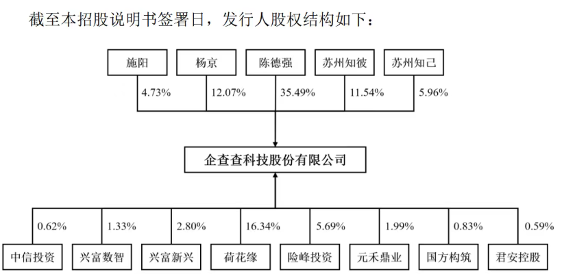 陈德强也是企查查的控股股东、实际控制人。根据招股书披露,其直接持有公司35.49%的股份,通过苏州知彼间接控制公司11.54%的股份,通过苏州知己间接控制公司5.96%的股份,合计控制公司53%的股份。