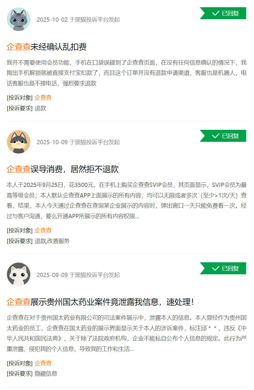 黑猫投诉平台上消费者针对企查查发起的投诉,图源:黑猫投诉平台截图