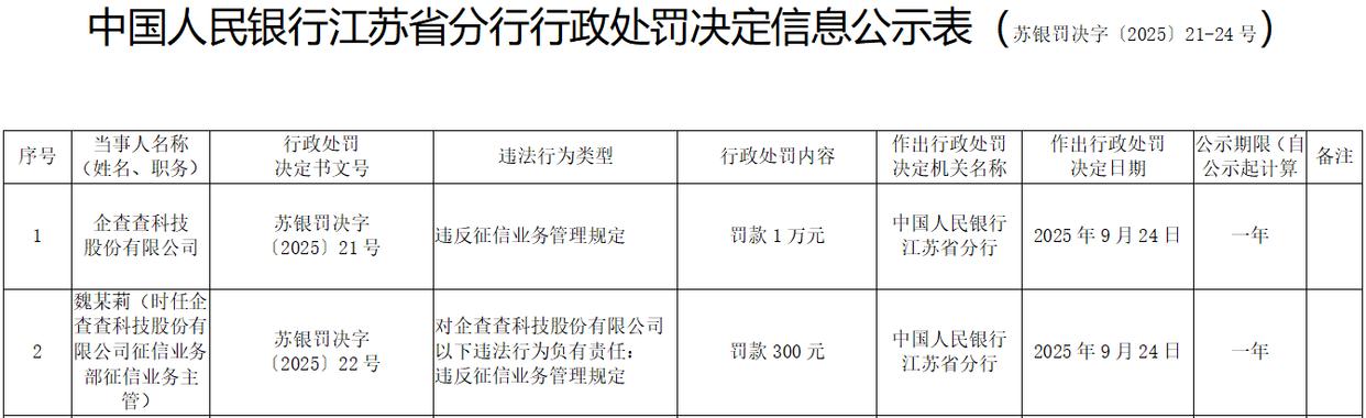 虽然企查查未直接明示和上述客户的具体合作内容,但就在招股书官网的前一天,中国人民银行江苏省分行发布罚单显示,企查查科技股份有限公司因违反征信业务管理规定,被罚款1万元。同时,时任该公司征信业务部征信业务主管魏某莉,对前述违法行为负有责任,被罚300元。