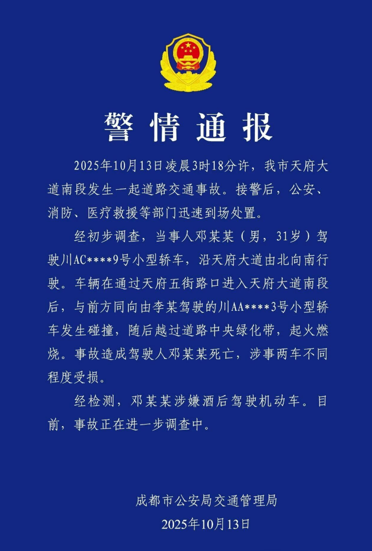 10月13日,成都市公安局交通管理局发布警情通报:“2025年10月13日凌晨3时18分许,我市天府大道南段发生一起道路交通事故。接警后,公安、消防、医疗救援等部门迅速到场处置。经初步调查,当事人邓某某(男,31岁)驾驶川AC****9号小型轿车,沿天府大道由北向南行驶。