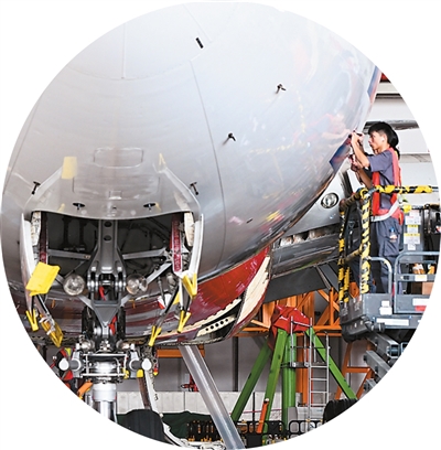 工作人员在海南自贸港一站式飞机维修产业基地检修飞机。