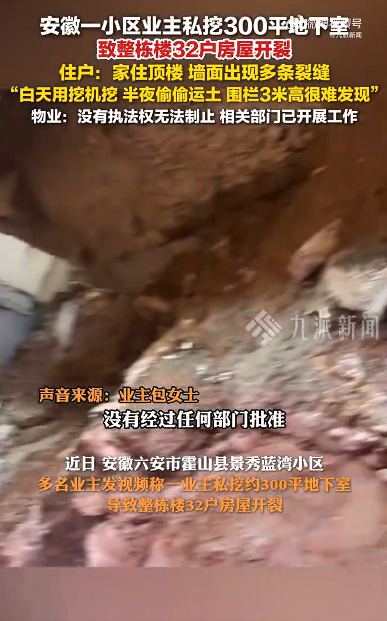 10月13日,安徽六安霍山县景秀蓝湾小区业主李青青(化名)反映,业主黄某某私自开挖近300平米地下室,导致整栋楼32套房屋开裂,经鉴定为C级房屋。该楼栋业主出示的鉴定报告显示,楼栋安全性等级综合评定为Cu级。业主包女士称8月份发现该业主私挖地下室,至今未得到妥善解决,自己家住顶楼9楼,家中墙面出现横向、纵向乃至八字形裂缝,窗台大理石断裂渗水。据澎湃新闻报道,物业称多部门在处置,住建局称已成立工作组。