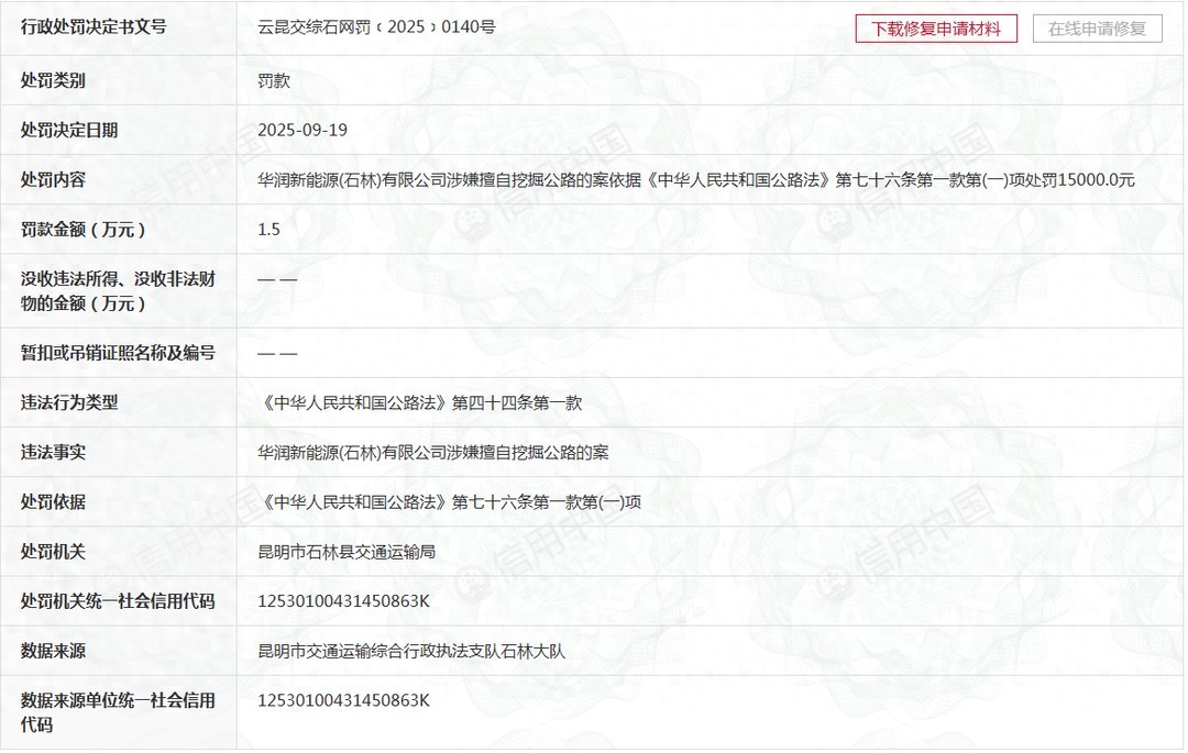 来自信用中国的信息显示,华润新能源(石林)有限公司因为涉嫌擅自挖掘公路被处罚。