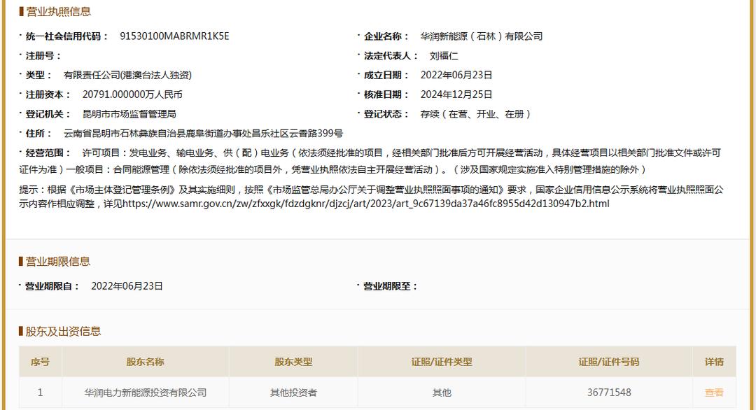 工商资料显示,华润新能源(石林)有限公司的单一股东是华润电力新能源投资有限公司。