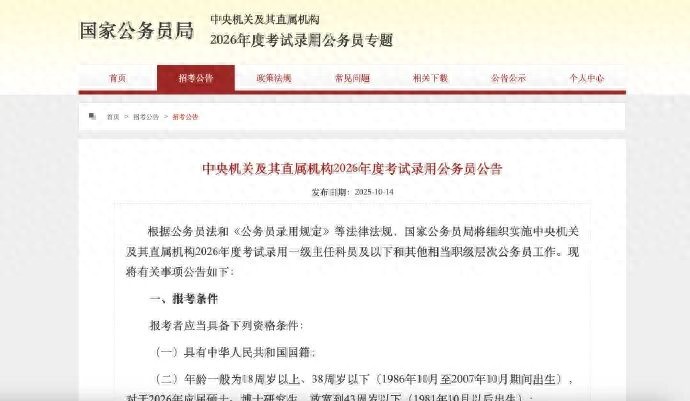 记者10月14日从国家公务员局获悉,中央机关及其直属机构2026年度考试录用公务员报名即将开始,共计划招录3.81万人。