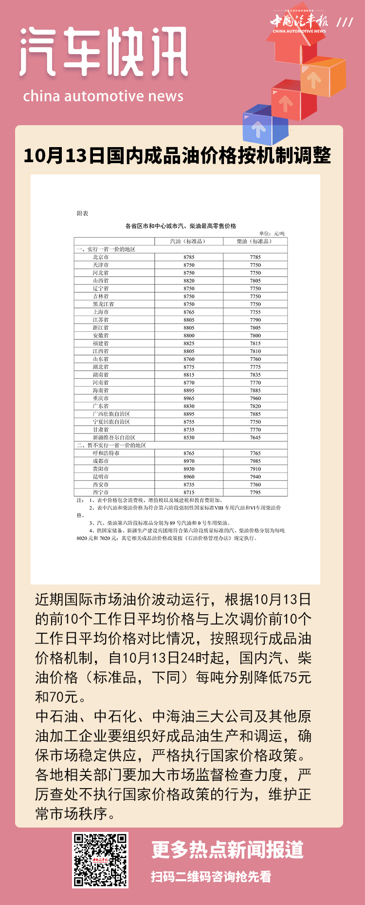 近期国际市场油价波动运行,根据10月13日的前10个工作日平均价格与上次调价前10个工作日平均价格对比情况,按照现行成品油价格机制,自10月13日24时起,国内汽、柴油价格(标准品,下同)每吨分别降低75元和70元。调整后,各省(区、市)和中心城市汽、柴油最高零售价格见附表。