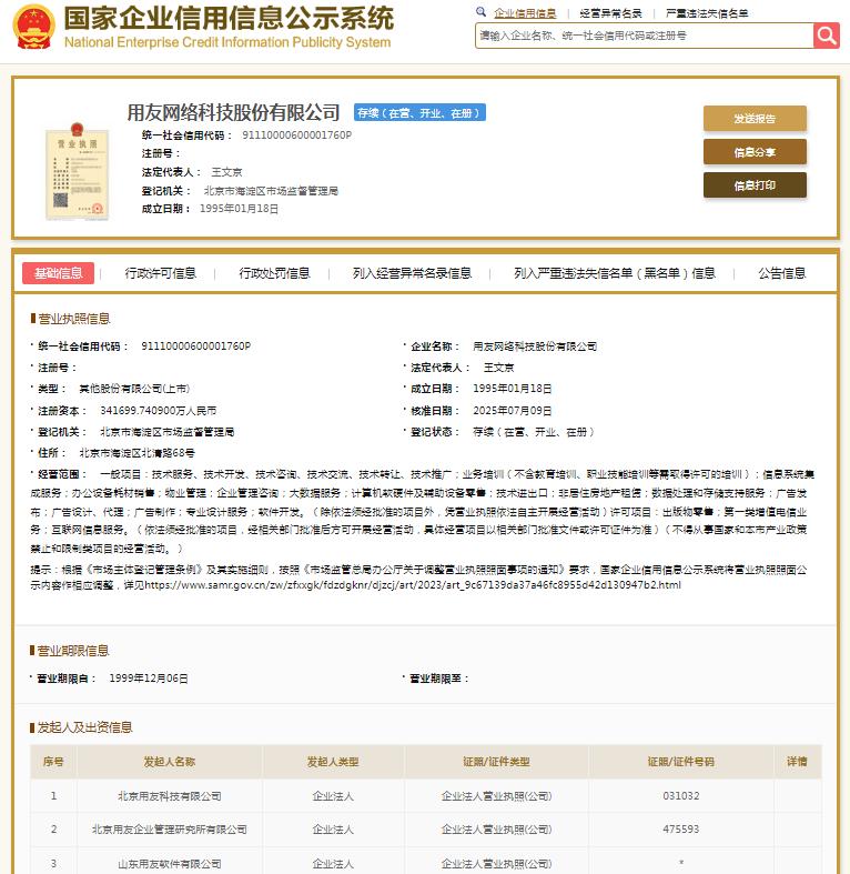 国家企业信用信息公示系统显示,用友网络科技股份有限公司成立于1995年,法定代表人王文京,注册资本341699.7409万元人民币。