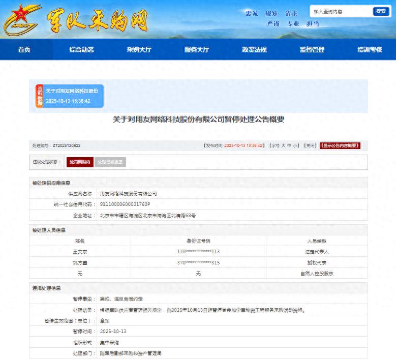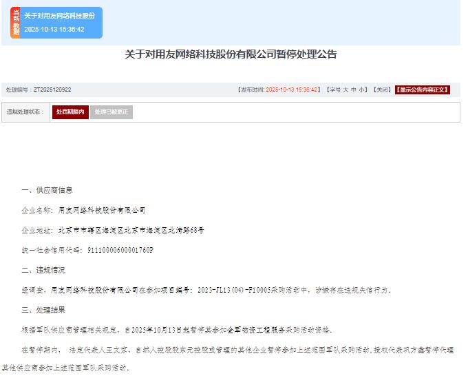 据悉,根据军队供应商管理相关规定,自2025年10月13日起暂停其参加全军物资工程服务采购活动资格。在暂停期内,法定代表人王文京控股或管理的其他企业暂停参加上述范围军队采购活动,授权代表巩方鑫暂停代理其他供应商参加上述范围军队采购活动。处理编号:ZT2025120922。违规处理状态:处罚期限内。