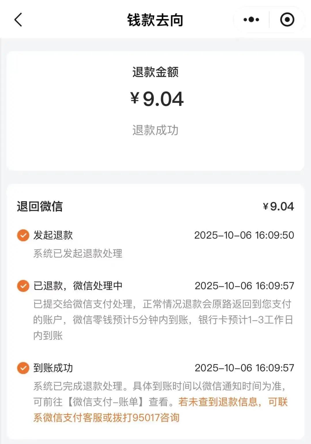 “一般40分钟就到了,但这次1小时手机一直没有送过来,直到订单被取消。”胡先生说。订单时间为10月6日下午3时2分,下午4时9分系统发起退款处理,7秒后9.04元跑腿费退至胡先生账户。