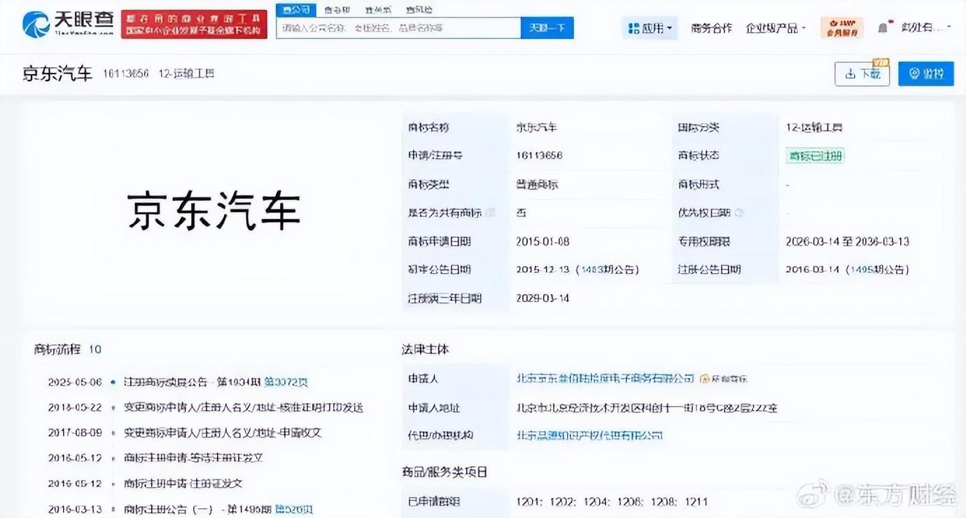 天眼查App显示,北京京东叁佰陆拾度电子商务有限公司已申请注册多枚“京东汽车”“京东汽车 JD AUTO”“京东汽车 CAR.JD.COM”商标,国际分类为运输工具、科学仪器、广告销售等,当前部分商标已注册成功。