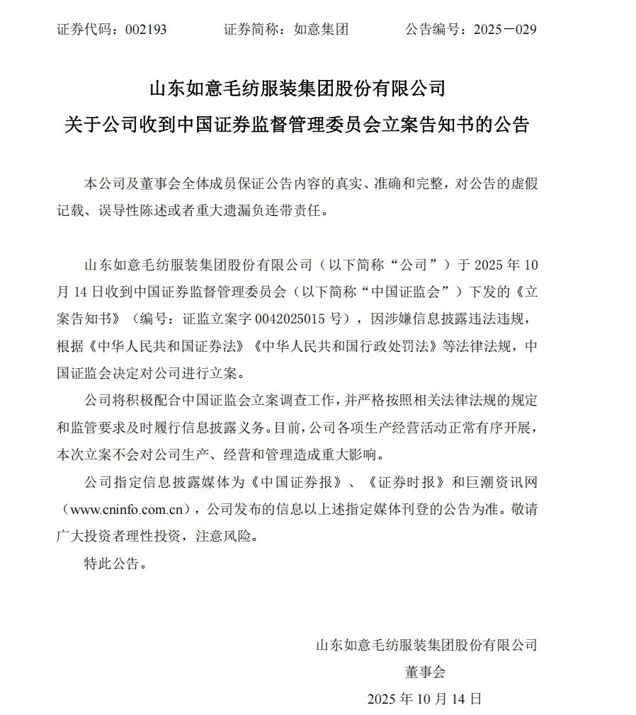 如意集团于10月14日晚公告,收到中国证监会下发的《立案告知书》,因涉嫌信息披露违法违规,根据相关法律法规,中国证监会决定对公司进行立案。