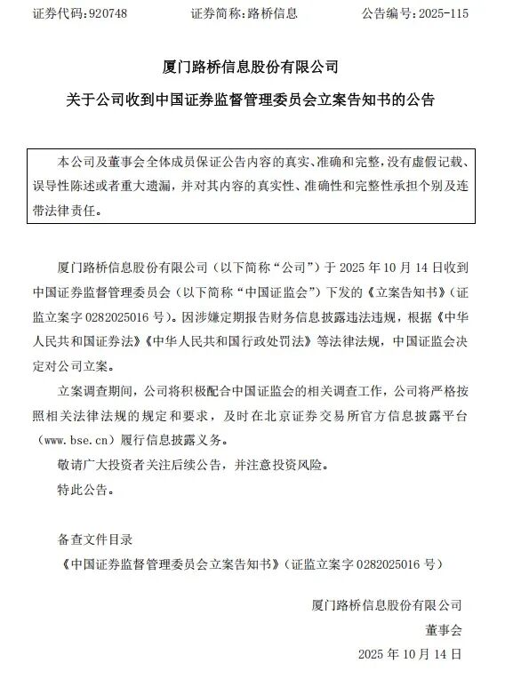 路桥信息同日公告称,公司于10月14日收到中国证监会下发的《立案告知书》。因涉嫌定期报告财务信息披露违法违规,根据相关法律法规,中国证监会决定对公司立案。