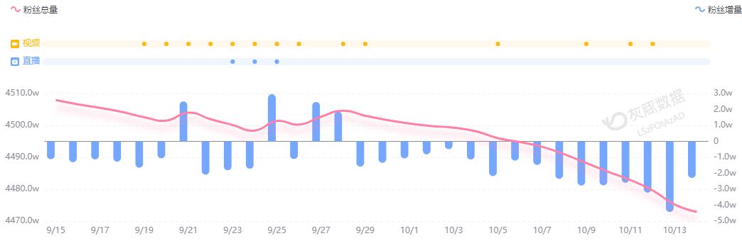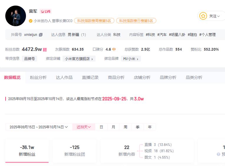 不久前,小米因“小字营销”翻车,雷军被质疑过度营销、人设崩塌,粉丝数量持续下滑。灰豚数据显示,9月15日至10月14日,雷军抖音账号近30日掉粉36.1万。从9月29日开始,雷军的抖音粉丝数量每天都在减少,最近15天减少了30.1万。10月14日,截至红星资本局发稿,雷军抖音粉丝数为4472.9万,两日内掉粉超6万。